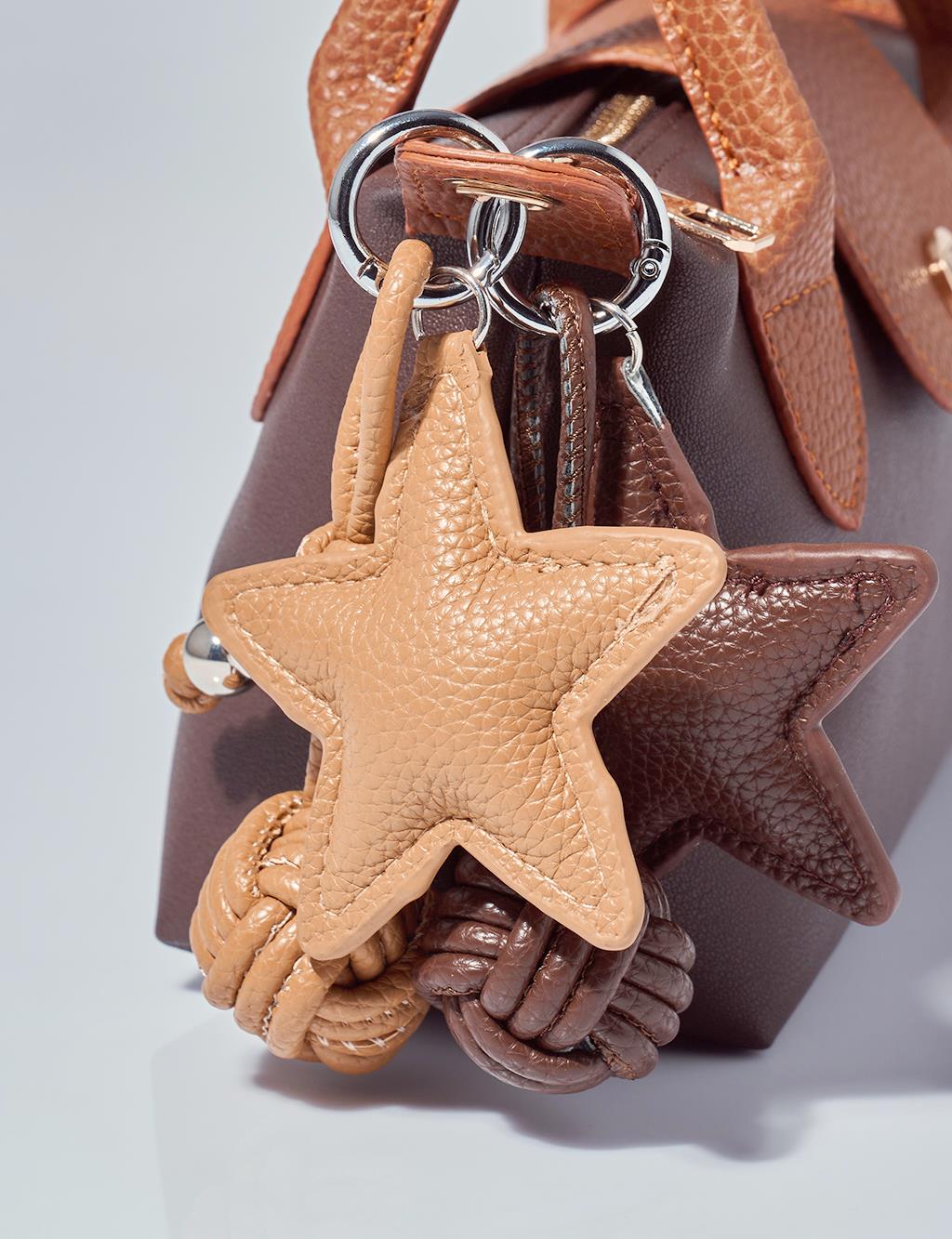 It stands out with its star detail. Thanks to the cleverly designed metal ring and clasp, you can safely carry it as a charm on your bags or as a keychain.