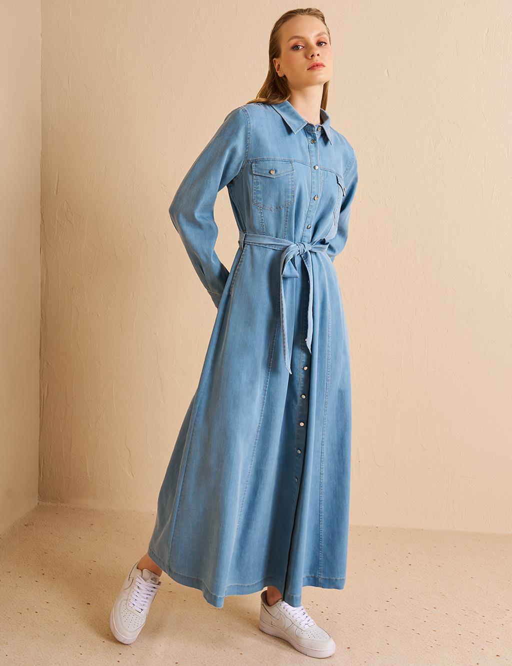 The Kayra Shirt Collar Belted Lyocell Dress stands out with its elegant design. The belt detail at the waist offers a feminine silhouette, while the shirt collar adds a modern and stylish touch. You can create a basic yet chic look by pairing it with earrings or a bag.