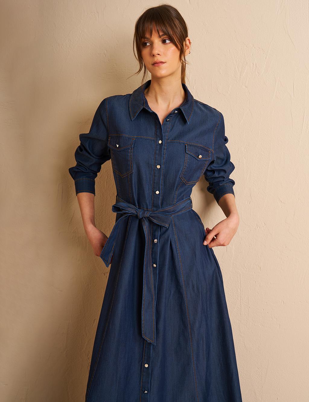 Shirt Collar Belted Lyocell Dress Navy Blue