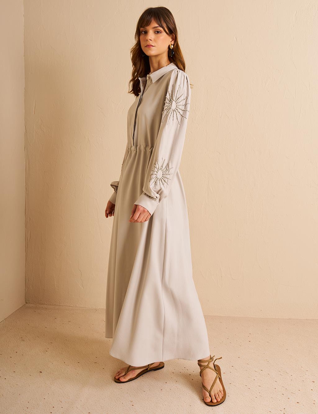Pearl Embellished Drawstring Waist Dress Light Gray