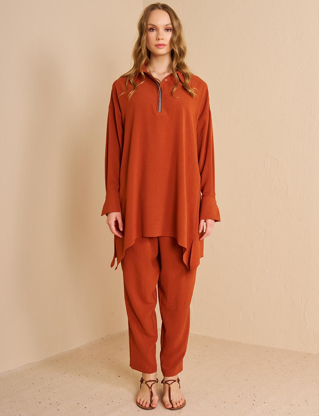 Shirt collar, hidden button closure with decorative placket detailing, dropped shoulders, wide cuffs, and an asymmetrical hem tunic. High-waisted pants with an elasticated back waist, zip and button closure, and side pockets. This is a two-piece set consisting of a tunic and pants.