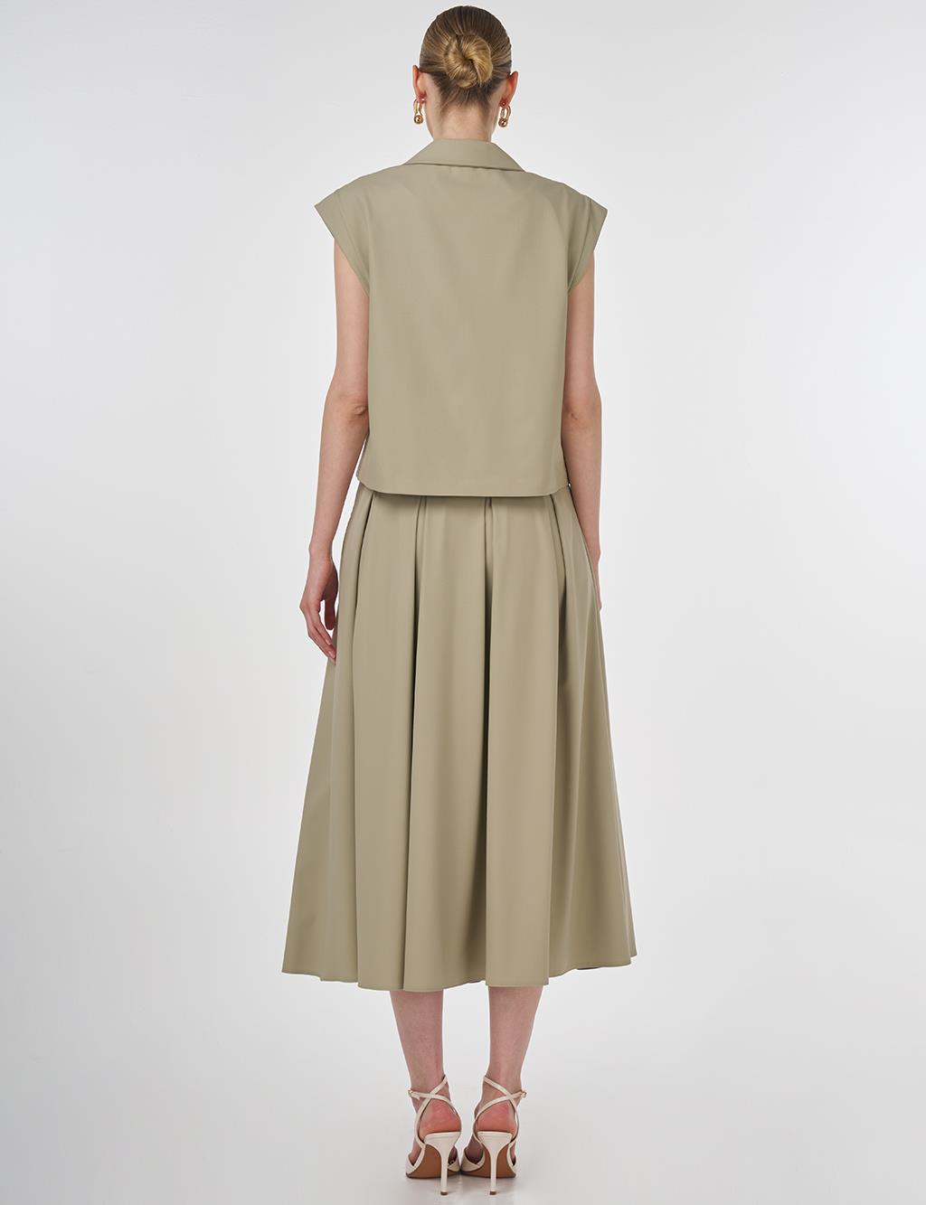 Notched collar, sleeveless, double-breasted button closure, lined jacket. High-waisted, side zip closure, pleated skirt. This is a two-piece set consisting of a jacket and a skirt.