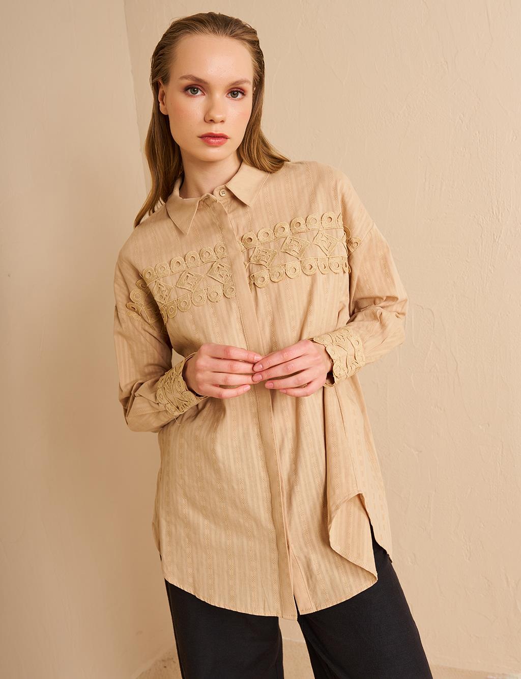 The Kayra 100% Cotton Tunic with Stripe Detail  is made from 100% breathable, moisture-wicking cotton fabric. Finished with delicate lace details, this tunic is ideal for seasonal transitions. Pair it with trousers, denim, earrings, or other accessories to complete your look.
