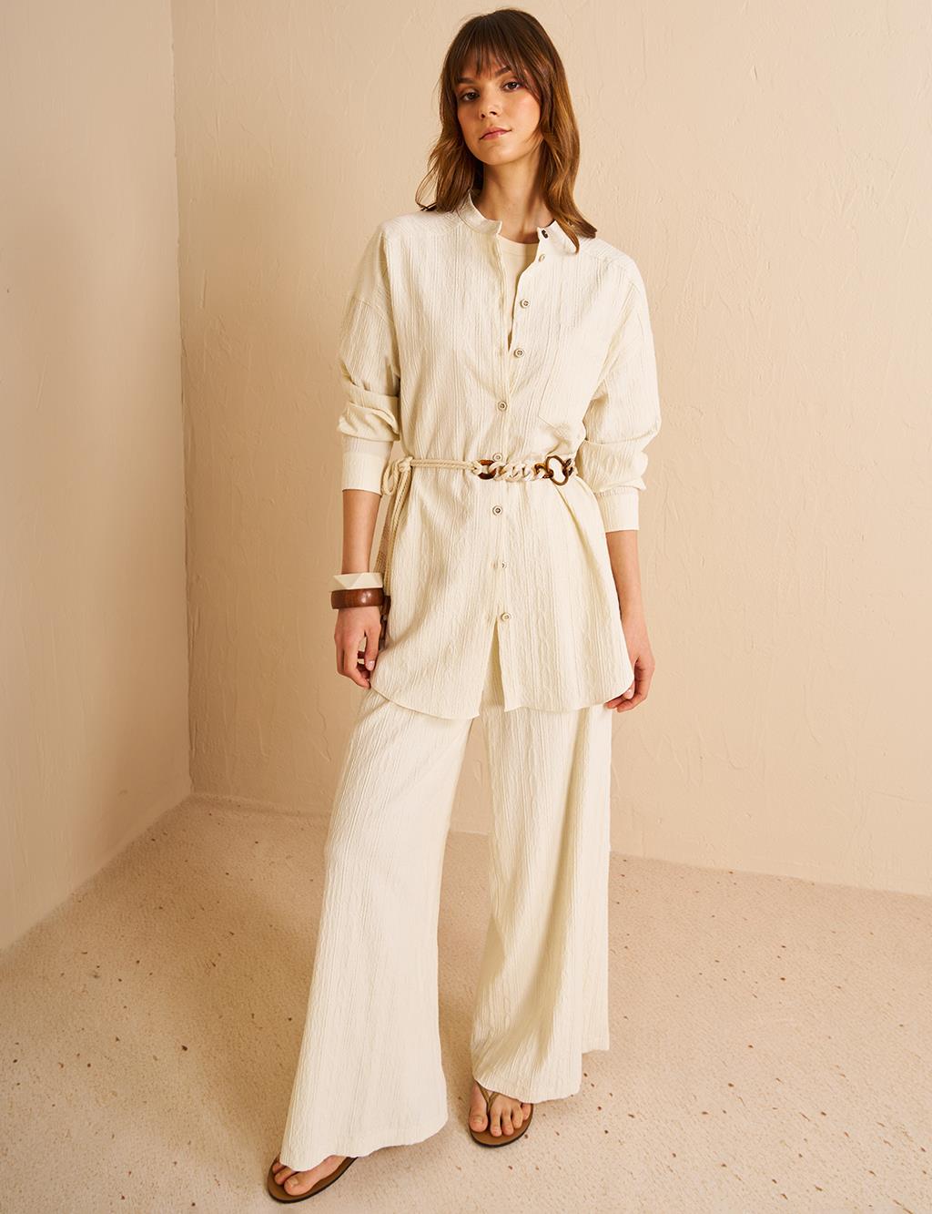 The Kayra Lace-Trim Textured Tunic perfectly balances comfort and elegance. Its fine seersucker texture adds a lightweight, modern touch, while the dropped shoulders highlight a sporty yet chic style. Pair it with denim, tailored trousers, earrings, or accessories for an effortlessly stylish look.