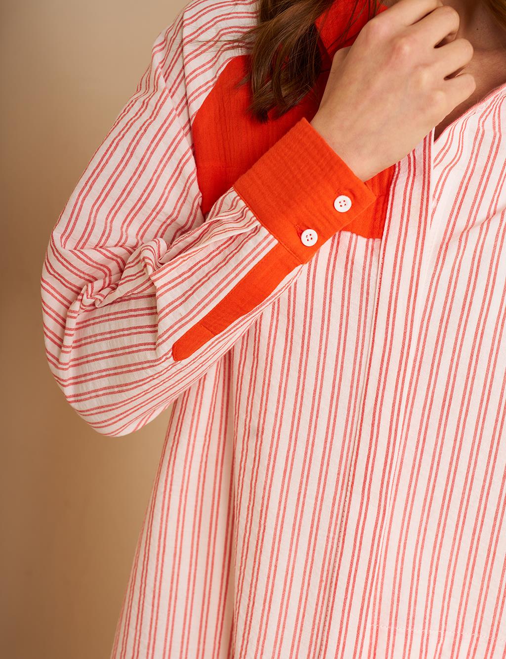 The Kayra  Fabric-Panel Cotton Tunic is crafted from lightweight, breathable cotton fabric that keeps you cool and comfortable. The fabric transitions create a dynamic look, while the hidden button placket offers minimalist elegance. Perfect for seasonal transitions, this tunic can be paired with trousers, denim, earrings, or accessories for a complete ensemble.