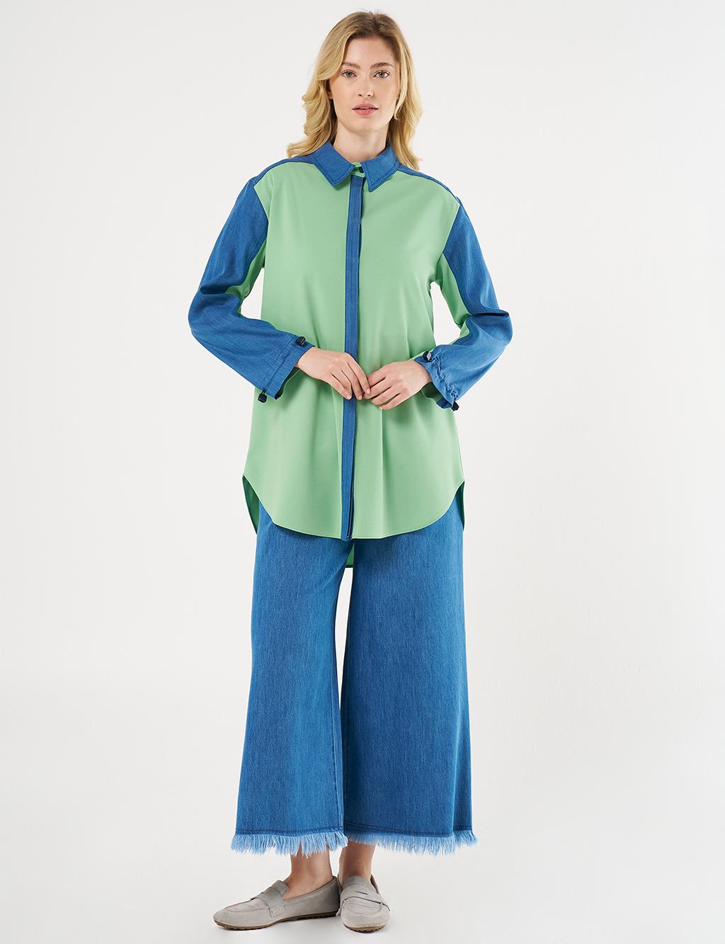 Denim-Trimmed Shirt Collar Tunic Light Green