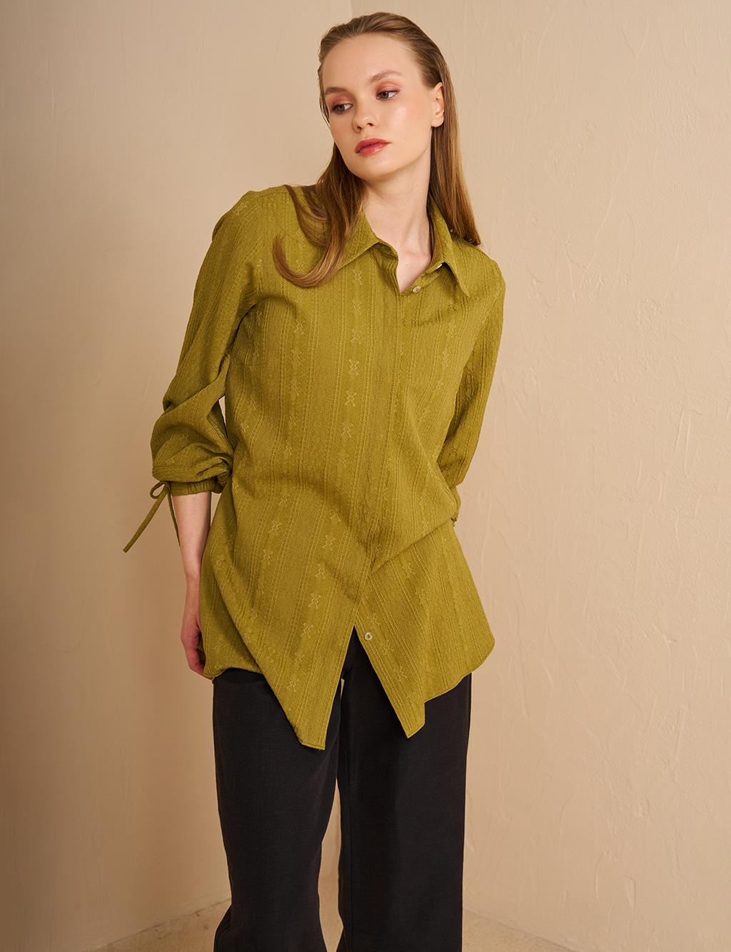 KYR Hidden Embossed Placket Tunic is made from a viscose blend fabric. Featuring a crinkled texture, this design is ideal for transitional seasons. Easily adaptable to everyday wear, it can be styled with denim, trousers, earrings, or bags for a complete look.